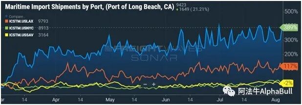 今年货运量向西海岸港口倾斜的趋势明显地体现在海关对海运进口的备案数据上(每个备案能代表任一货运量)。