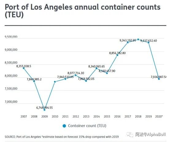 塞罗卡表示,2020年余下时间中,洛杉矶港货运量将同2008年经济衰退时期持平或更低,即低于800万TEU;如若上述预估数字准确,同2019年相比,货运量将下降15%。