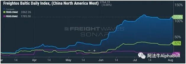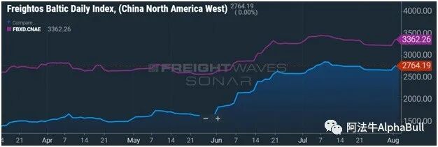 Freightos的数据显示,8月中旬,亚洲-美国西海岸的运价已升至2764美元/FEU。