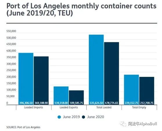 6月,洛杉矶港处理量为691475TEU,考虑到贸易战与疫情,他认为这个月“情况尚可”。他还比较了去年数据的历史高点与今年低迷期。