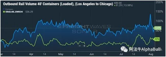 铁路数据也说明了同样的问题。自3月1日以来,洛杉矶到芝加哥运输40英尺标准集装箱货物数量增长了64%,但从新泽西到芝加哥的货运量仅增长6%。
