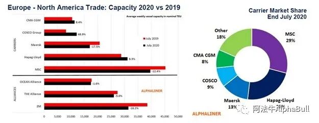 Alphaliner的报告称,欧洲-北美的7月份周运力与去年同期相比下降了4.8%,且地中海航运和马士基航运在削减运力方面做出了最大努力,也就是说2M联盟已暂时停止了其四条北欧-美国东海岸服务航线中的一条。