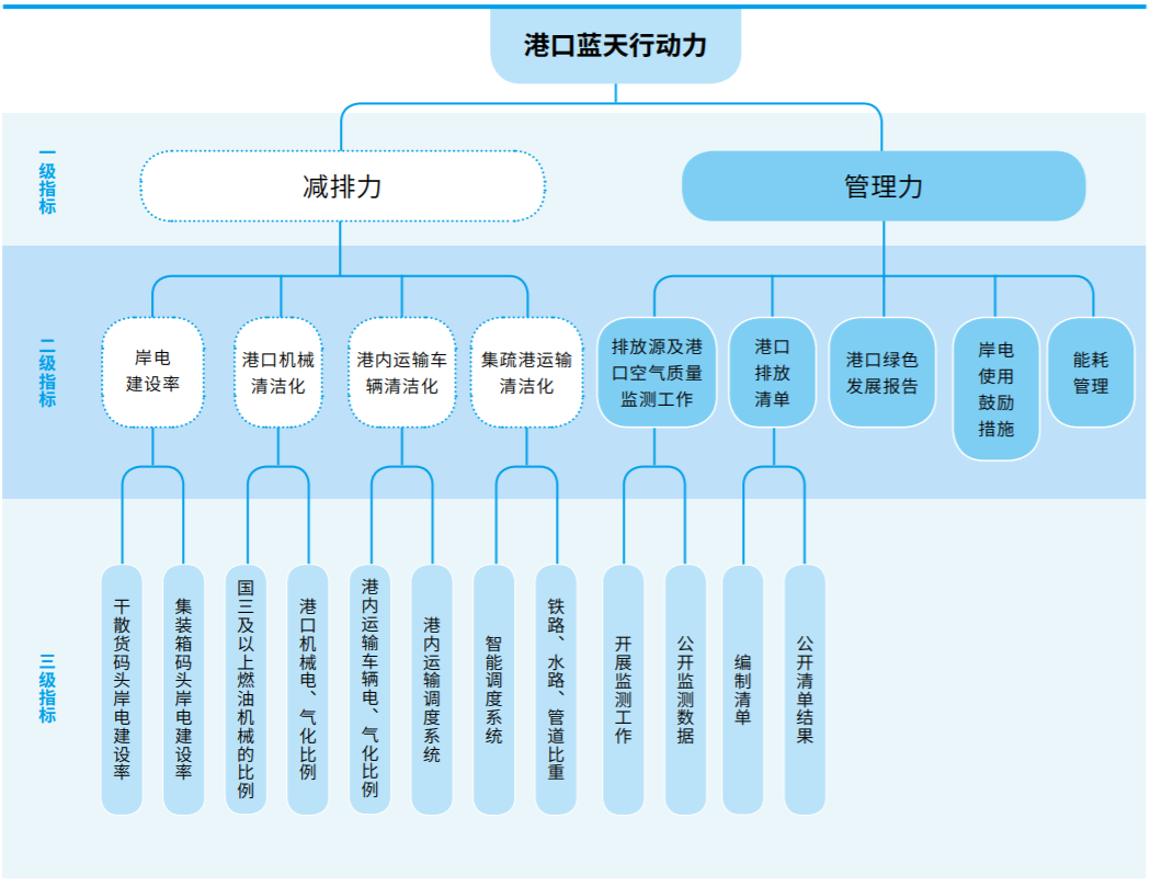 项目将港口蓝天行动力划分为减排力和管理力两类。其中,减排力措施侧重于从技术角度减排,在国家相关政策中或者有明确要求、或者是政策鼓励的方向,包括岸电建设、港口机械清洁化、港内运输车辆清洁化、集疏港运输清洁化和货物污染控制。