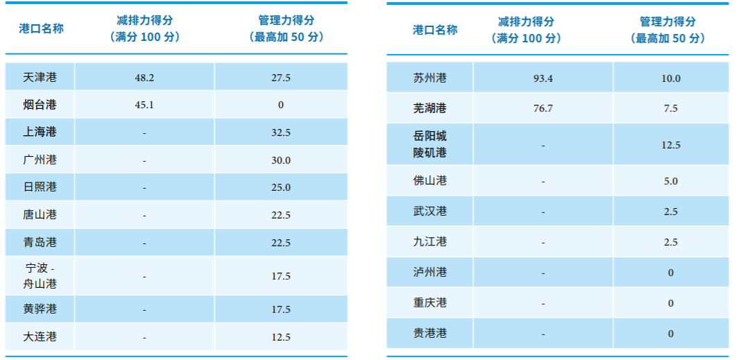 2019 年典型港口减排力和管理力中,沿海港口仅有天津港和烟台港的数据支持减排力打分,得分分别为 48.2 和 45.1。沿海港管理力平均得分为 23.1,最高分是上海港,得分为 32.5 分。 内河港口中仅有苏州港和芜湖港的数据支持减排力打分,得分分别为 93.4 和 76.7。内河港管理力平均得分为 4,最高为岳阳城陵矶港,得分为 12.5 分。而泸州港、重庆港、贵港港的管理力得分为 0。由于沿海港和内河港在各方面都不同,因此不能作直接比较。造成沿海港和内河港之间减排力差距的主要原因是沿海港在岸电建设率进展上整体低于内河港,这也是由于投资成本等客观原因造成的。