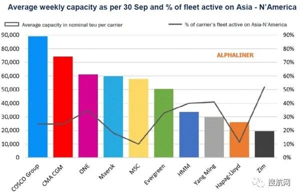 据国际航运咨询机构Alphaliner分析,跨太平洋航线上的顶级船公司部署的运力,截至9月30日,中远集团(包括中远海运和东方海外)的运力排名最高,平均每周运力为89,050标准箱。