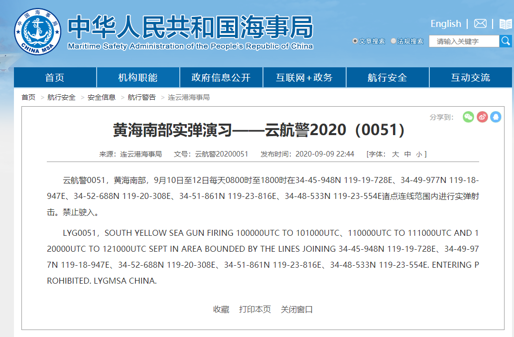 云航警0051,黄海南部,9月10日至12日每天0800时至1800时在34-45-948N 119-19-728E、34-49-977N 119-18-947E、34-52-688N 119-20-308E、34-51-861N 119-23-816E、34-48-533N 119-23-554E诸点连线范围内进行实弹射击。禁止驶入。
