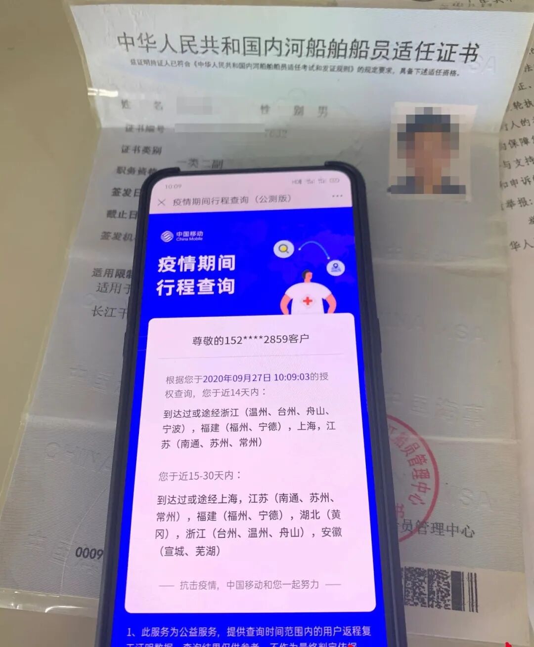 27日,大型内河船“JH7799”轮来到长兴海巡执法大队管区某码头,执法人员立即登船开展检查。船方以为关闭AIS后海事部门便无迹可查,因此百般抵赖。执法人员首先确认了船员的在船履职事实,通过手机行程查询确认其历史行动轨迹,从而间接证实了该船从事海上运输的违法事实。在铁一般的证据面前,船方交代了“曲线救国”策略:关闭AIS自海上穿过封锁线,到达上游江苏锚地后,再开启AIS伪装成从长江上游开往下游船舶的身份靠泊码头,从而掩盖其违法海上运输的行为。