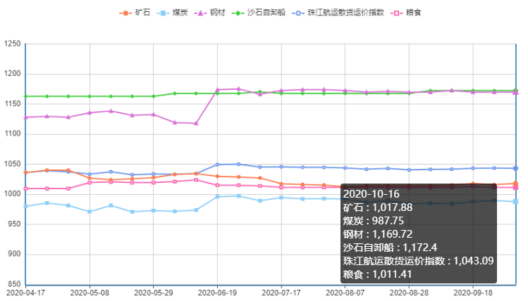 “寒露”已过,电煤消费迎来淡季,下游煤炭需求偏弱,本期煤炭航线运价指数有所回落,环比跌幅为0.182%,其中珠海-贵港、黄埔-贵港航线运价指数分别上涨0.932%和0.187%,南沙-江门、虎门-佛山、黄埔-佛山、南沙-佛山航线运价指数环比有所下跌,其中以虎门-佛山环比跌幅1.303%最大。