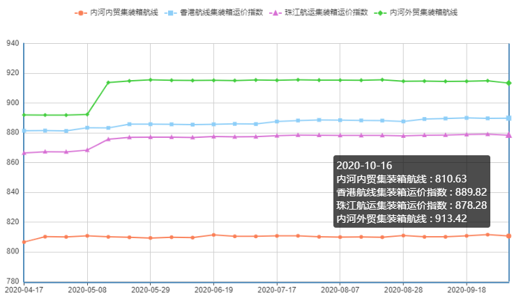 内河内贸方面,长假过后市场供需动态调整,运力回归供大于求,本期运价指数由涨转跌,环比跌幅为0.111%。其中黄埔-南沙、南沙/黄埔/虎门-清远、南沙/黄埔-肇庆、南沙/黄埔/虎门-梧州、/南沙/黄埔/虎门-珠海航线运价指数环比均有不同程度的下跌,其中以南沙/黄埔/虎门-清远航线跌幅0.778%最高,南沙/黄埔/虎门-贵港航线运价指数环比上涨0.037%,其他航线保持平稳。