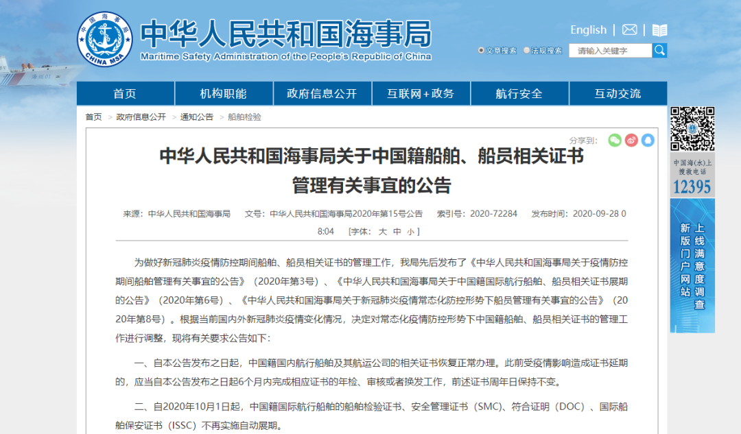 二、自2020年10月1日起,中国籍国际航行船舶的船舶检验证书、安全管理证书(SMC)、符合证明(DOC)、国际船舶保安证书(ISSC)不再实施自动展期。
