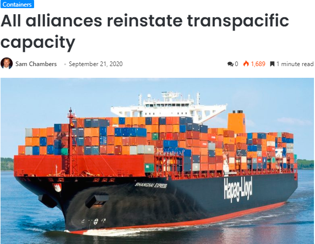 目前三大联盟都承诺在十月的跨太平洋贸易航线上恢复停航。鉴于近期跨太平洋航线持续强劲需求,作为2M联盟之一的马士基(Maersk)上周传达了其恢复从亚洲到北美西海岸的停航计划(查看文章:马士基取消所有跨太平洋航线的停航),海洋联盟成员的中远海运和其子公司东方海外(OOCL)也宣布恢复跨太平洋航线的停航。同时,THE联盟成员赫伯罗特(Hapag-Lloyd)告诉客户,它将在下个月除五个航次停航之外将恢复所有剩余至美国西海岸的跨太平洋航线停航航次。
