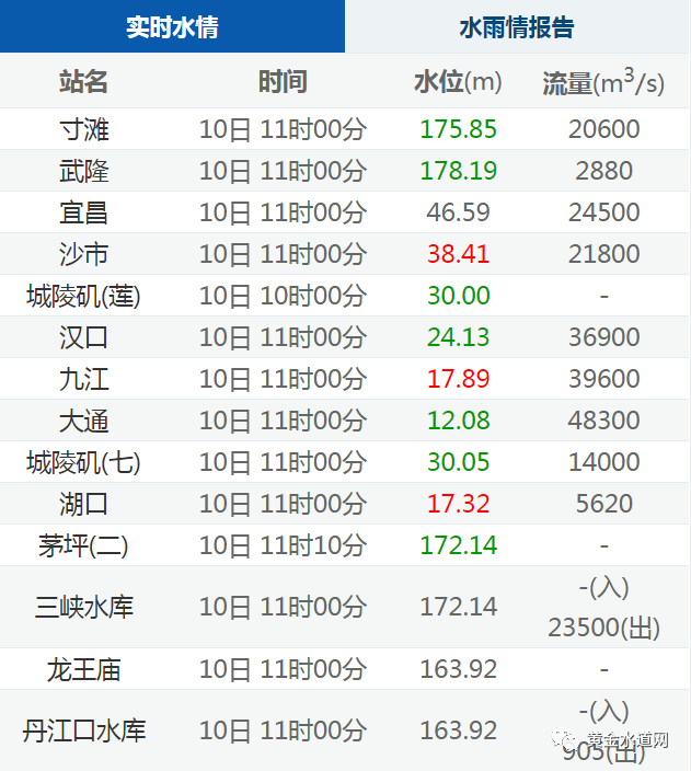 【水情】长江流域重要站实时水情(2020年10月10日11时)