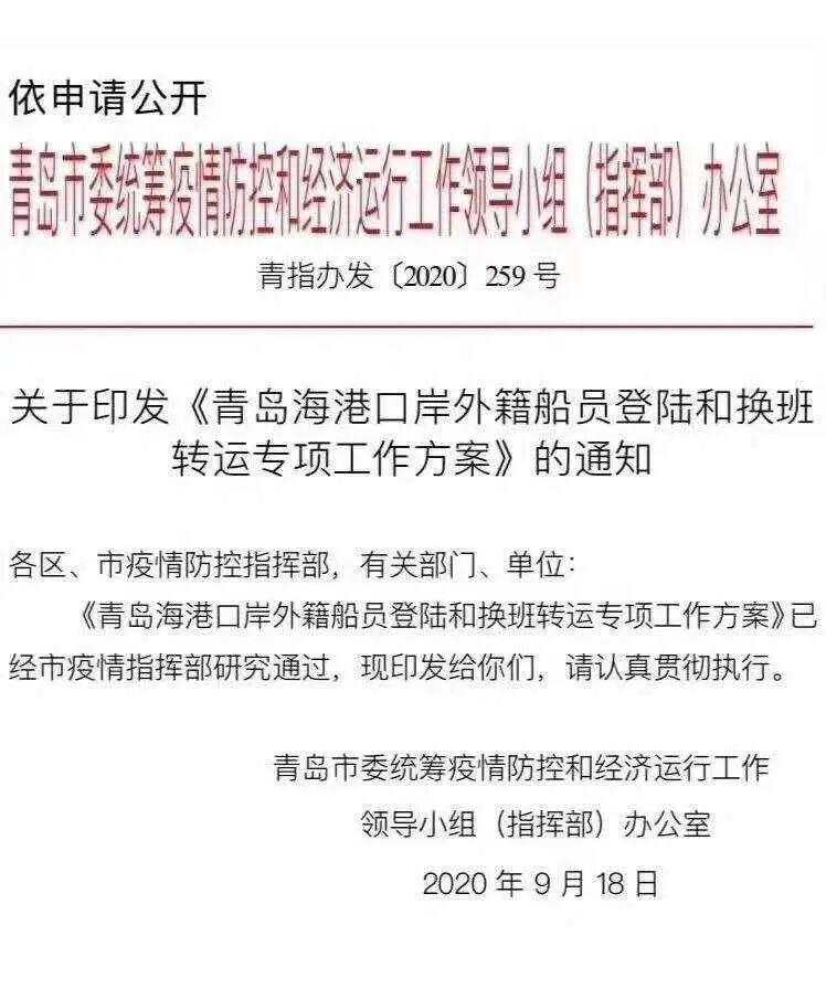 青岛市委统筹疫情防控和经济运行工作领导小组(指挥部)办公室的发文,已经明确了青岛港允许外籍船员换班。