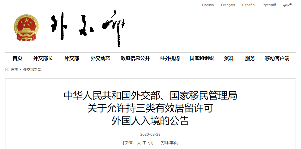 9月23日下午,中国外交部官网发布《中华人民共和国外交部、国家移民管理局关于允许持三类有效居留许可外国人入境的公告》,根据公告,从9月28日零时起,允许持三类有效居留许可外国人入境。
