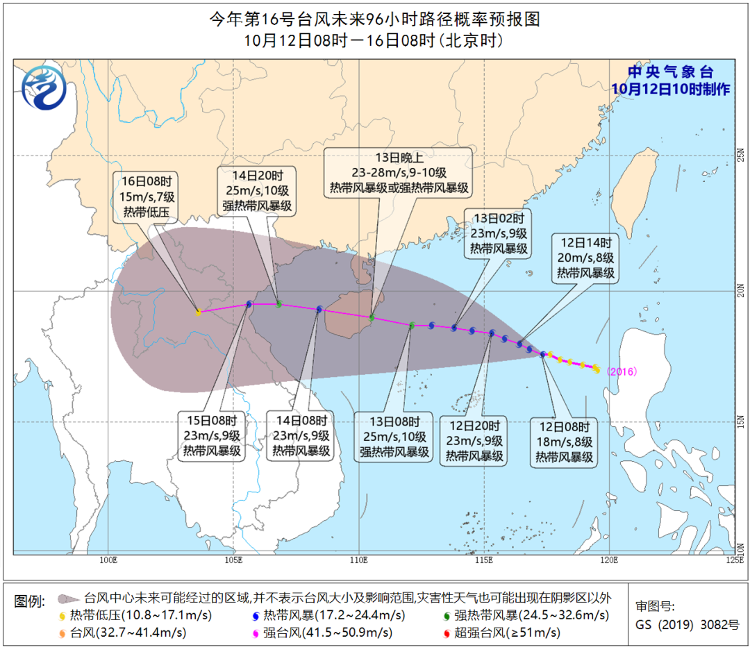 预计,该台风强度继续增强,并将于13日夜间在海南东部到广东雷州半岛一带沿海登陆(登陆强度23~28米/秒 ,9~10级,热带风暴级或强热带风暴级)。中央气象台12日上午继续发布台风蓝色预警。