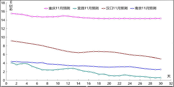 目前,拉尼娜现象已经形成,预计今年的拉尼娜现象强度为中等到强,影响世界诸多地区的温度、降水和风暴型式。11月,长江流域降雨将继续减少。据中期天气预报,大部地区降水较常年偏少或接近常年。三峡调度方面,三峡11月下泄流量按照葛洲坝(庙嘴)水位不低于39.0米和三峡电站保证出力对应的流量控制。据此预测:三峡库区水位11月将基本维持在174.5m 左右;坝下水位波动走低。11月水位趋势预测如下(仅供参考):