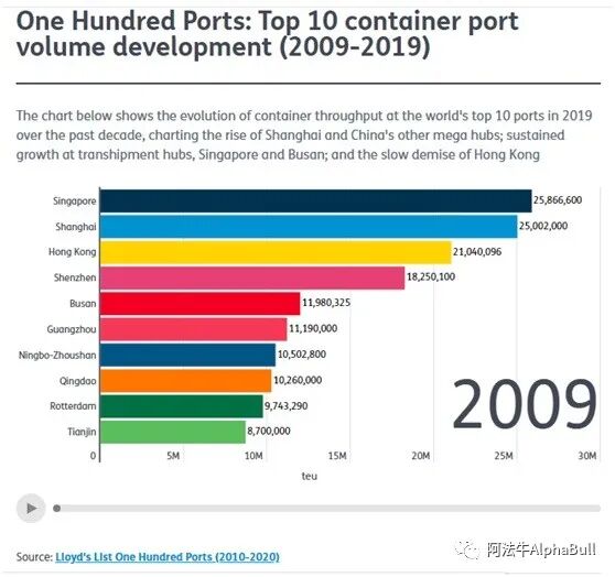 上海领跑,在本世纪初就超过了新加坡,2019年的吞吐量比2009年增长了73%以上