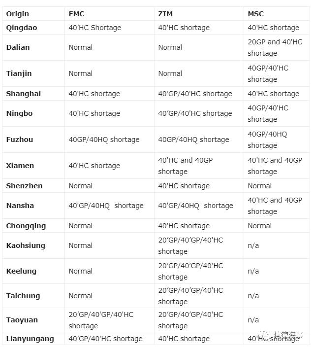 Container Xchange汇总的上周我国港口集装箱短缺情况。图源:信德海事