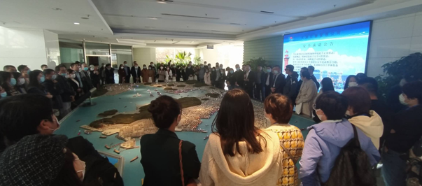 在新港商务大厦1楼,大连自贸片区(保税区)管委会制度创新及企业服务一局副局长孙世伟在大连港区全貌沙盘前向嘉宾们详细介绍了大连港区的相关情况,各码头分布情况,业务概况和港区变迁历史。嘉宾们对大连港的情况有了进一步的了解。