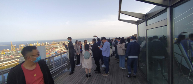 之后,嘉宾们登上大厦28楼顶楼观景天台,俯瞰整个大连大窑湾港区全貌。嘉宾们感叹大窑湾港区恢弘的同时,纷纷拍照留念。