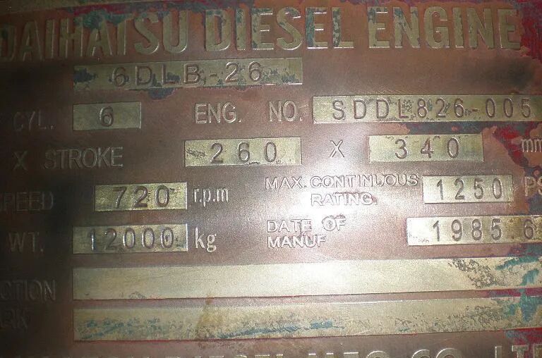 某船柴油发电机型号为DAIHATSU6DLB一26型。