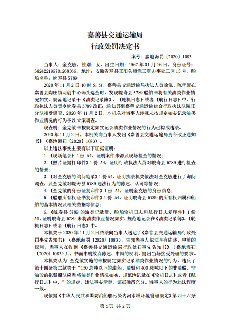 2020 年 11 月 2 日 10 时 51 分,嘉善县交通运输局执法人员在嘉善县陶庄镇两创中心码头巡查时,发现皖寿县 5789 船舶未将有关油类作业情况如实、规范地记录于《油类记录簿》、《轮机日志》或者《航行日志》中,行政执法人员责令皖寿县5789改正,并通知其到嘉善交通运输综合行政执法队陶庄分队接受调查。11 月 2 日,县交通局对当事人涉嫌未按规定如实记录油类作业情况的行为给予罚款叁仟元的行政处罚。