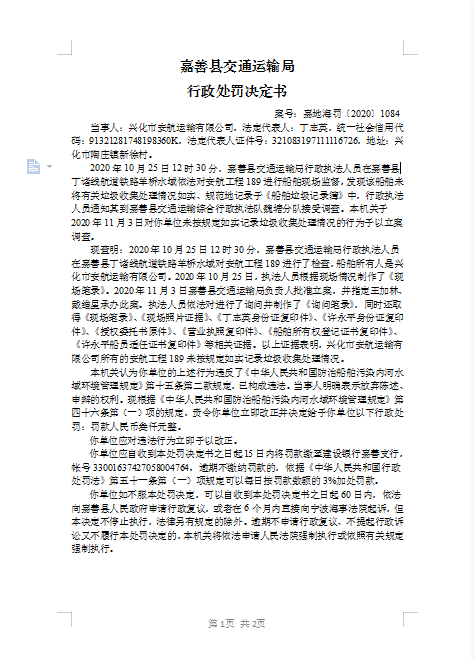 2020年10月25日12时30分,嘉善县交通运输局行政执法人员在嘉善县丁诸线航道铁路羊桥水域,依法对安航工程189进行船舶现场监督,发现该船舶未将有关垃圾收集处理情况如实、规范地记录于《船舶垃圾记录簿》中,行政执法人员通知其到嘉善县交通运输综合行政执法队魏塘分队接受调查。11 月 3 日,县交通局对当事人涉嫌未按规定如实记录垃圾收集情况的行为给予罚款叁仟元的行政处罚。