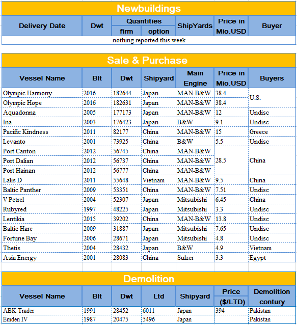 BCI周五报收1507点,同比上周末下跌232个点。海岬型船期租水平周五报收12,498 美元/天,同比上周下跌1,923美元/天。海岬型船市场再次下跌。C3航线上半周微涨至14.5美元/吨的水平,下半周期货现货同时走低,周五企稳报收于13.71美元/吨,同比上周下跌了0.45美元/吨。C5上半周运费成交在7.00美元/吨左右,下半周跌至6.50美元/吨左右,周五报收于6.55美元/吨,同比上周下跌了0.27美元/吨。