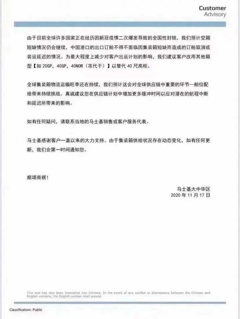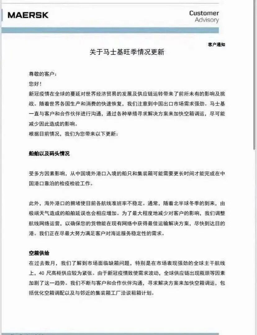 据雨果网消息,11月17日,关于旺季的货运情况,集装箱航运公司马士基向客户发出了最新通知,其表示:由于新冠疫情致使需求波动,全球供应链出现瓶颈等因素加剧了这一趋势。中国港口的出口订舱不得不面临因缺箱等造成的订舱取消或装运延迟。