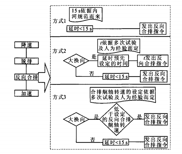 反向合排指令并非是脱排后马上发出,该指 令发出时机是否适宜,是主机是否会熄火 的关键步骤,无论是开环遥控系统还是闭环遥控系统,对于该指令的发出一般有如图1所示的3种方式。