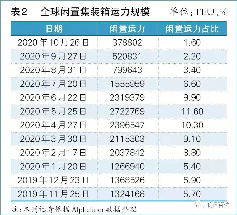 相较年初,实际投入船舶运力的增长主要在于闲置运力规模下降。从闲置运力下降规模来看,10月下旬已经降至约38万TEU,较年初减少约100万TEU(见表2)。如果运力与集装箱的配比按约1∶1.8计算,相较年初重归运营的运力需要匹配集装箱180万TEU!