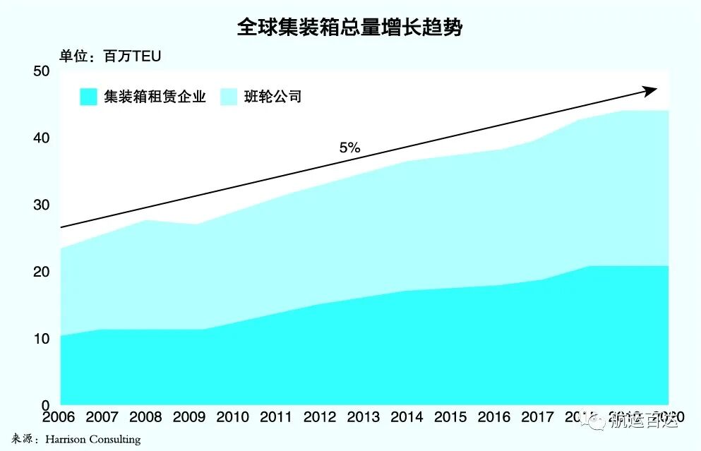 根据英国咨询机构HarrisonConsulting的数据,截至一季度末,全球集装箱总量约为4400万TEU(见图)。由于世界贸易的疲软,2019年全球新造集装箱仅为250万TEU(Textainer业绩报告),相对于2018年的400万TEU水平大幅下降。根据德鲁里数据,全球集装箱每年更新占比约5%,依此计算,2019年的新造集装箱投入对存量增长贡献较小。