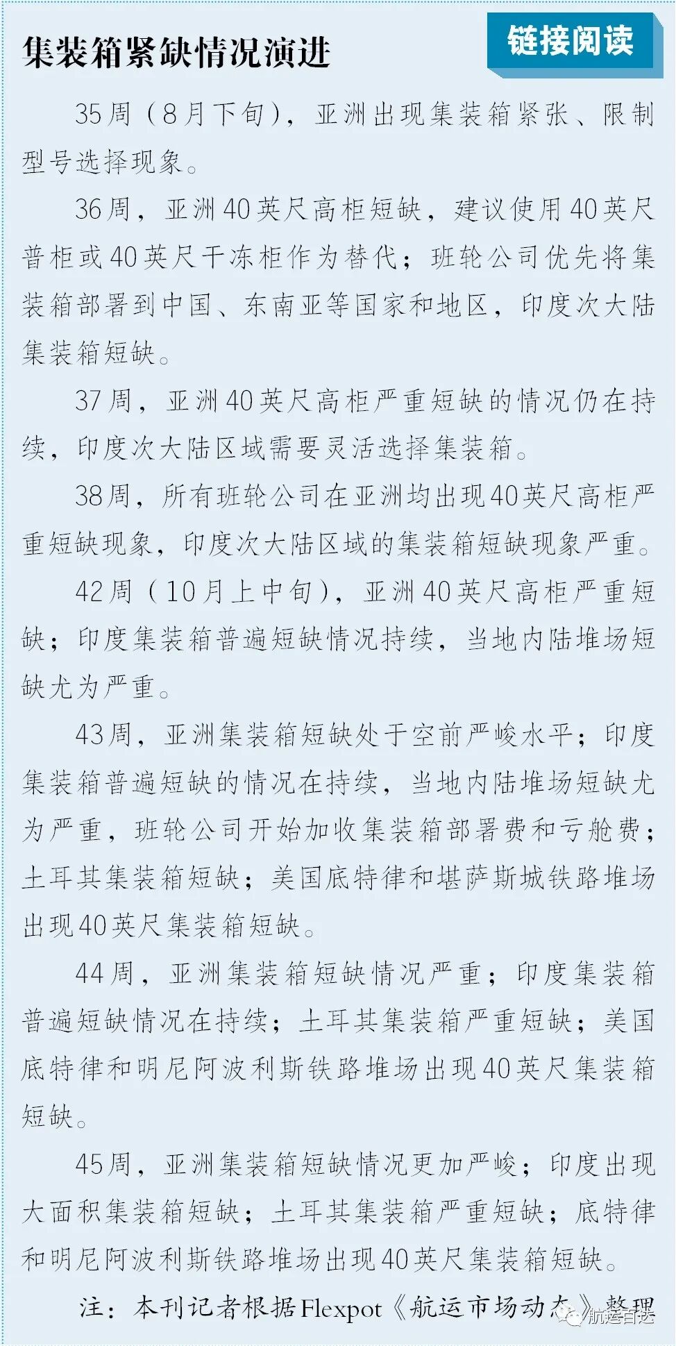 10月下旬,《American Shipper》报道:“集装箱严重短缺,所有集装箱制造工厂订单已满,产能满负荷运转,无法制造出更多集装箱。随着漫长的货运高峰季的到来,运输可能中断,商店可能无货可卖,造成严重后果。”显然,集装箱紧缺已经严重影响全球物流的正常运转。