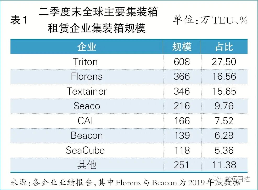 集装箱租赁企业的市场集中度较高,全球前三大集装箱租赁企业Triton、Florens和Textainer控制集装箱超过1300万TEU,份额约60%(见表1)。不过,2019年前述企业的集装箱规模增长缓慢甚至萎缩。