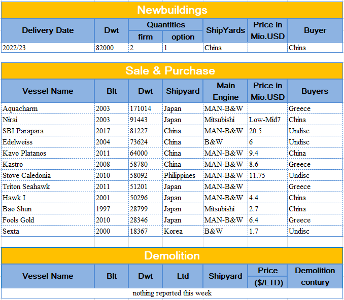 BPI周五报收1353点,同比上周末上涨155个点。巴拿马型船期租水平报收12,176美元/天,同比上周上涨1,396美元/天。巴拿马型船市场上涨。大西洋市场,TA和美湾都有持续新增货盘,成交上涨,南美市场需求一般,但在整体氛围带动下,82k成交也涨至14,000美元/天,加 400,000 美元的空放补贴的水平。太平洋市场,Nopac非常活跃,82k成交大概在12,000美元/天的水平。东澳有一些新增货盘,82k成交在11,000美元/天以上。期货市场也在上涨,期租活跃度提高。