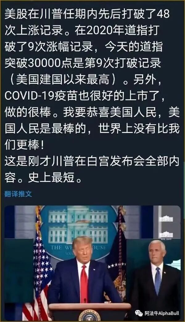 特朗普吹嘘说,在他的四年任期内,美股打破了48次上涨记录。2020年道指打破9次涨幅记录。今天的道指突破3万点,是第九次打破纪录,也是美国建国以来最高。此外,新冠疫苗也上市了。