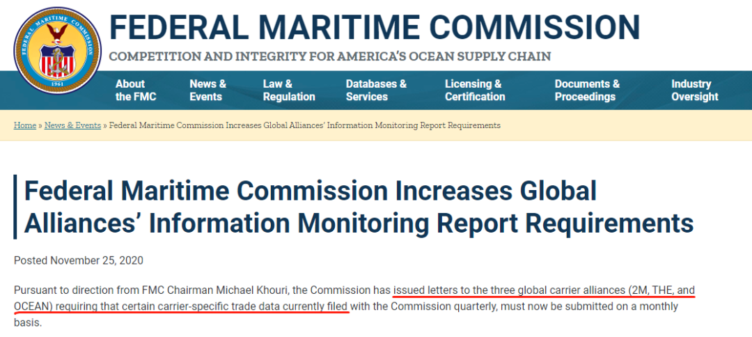 美国联邦海事委员会(FMC)为了打击潜在的违反竞争法规的行为,美国当地时间11月25日宣布采取强有力的措施,加大对三大航运联盟的监管力度。