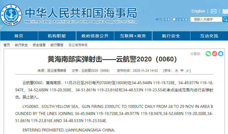 据连云港海事局消息:云航警0060,黄海南部,11月25日至29日每天0700时至1800时在34-45.948N 119-19.728E、34-49.977N 119-18.947E、34-52.688N 119-20.308E、34-51.861N 119-23.816E和34-48.533N 119-23.554E诸点连线范围内进行实弹射击。禁止驶入。