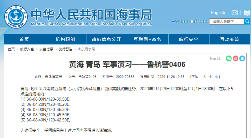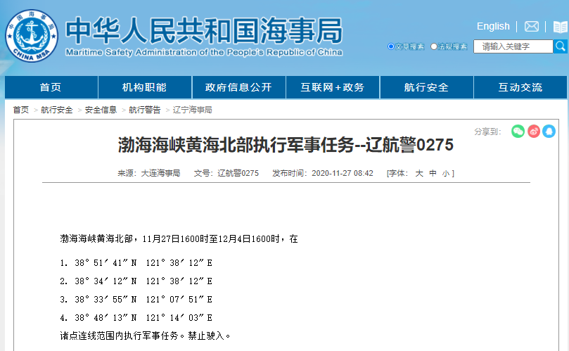 据大连海事局消息:渤海海峡黄海北部,11月27日1600时至12月4日1600时,在