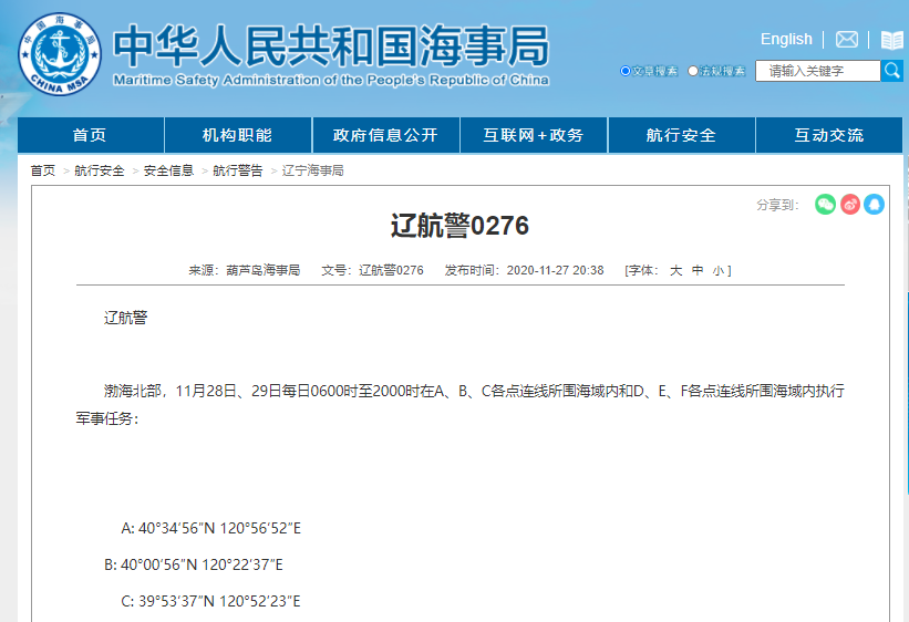 任何船只在上述时间内不得进入该海域,希各航船注意。辽航警。