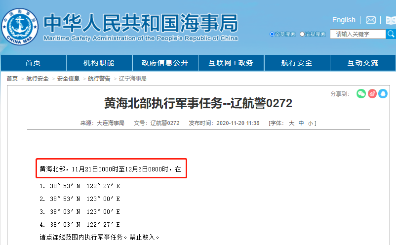 据大连海事局消息:黄海北部,11月21日0000时至12月6日0800时,在