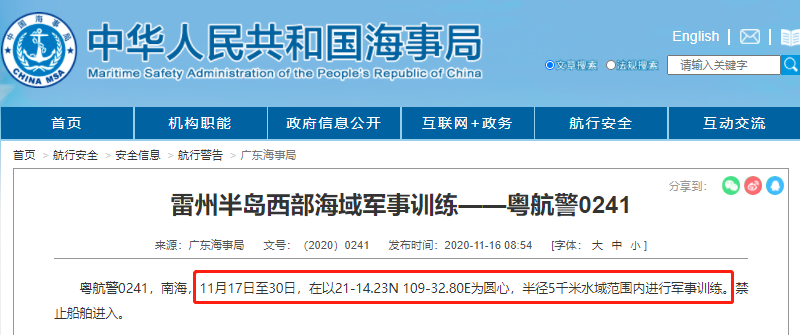 据广东海事局(粤航警0241)消息:南海,11月17日至30日,在以21-14.23N 109-32.80E为圆心,半径5千米水域范围内进行军事训练。禁止船舶进入。