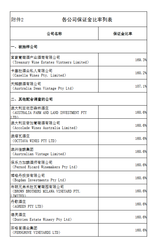 自2020年11月28日起,进口经营者在进口原产于澳大利亚的相关葡萄酒时,应依据本初裁决定所确定的各公司的倾销幅度向中华人民共和国海关提供相应的保证金。保证金以海关审定的完税价格从价计征,计算公式为:保证金金额=(海关审定的完税价格×保证金征收比率)×(1+进口环节增值税税率)。