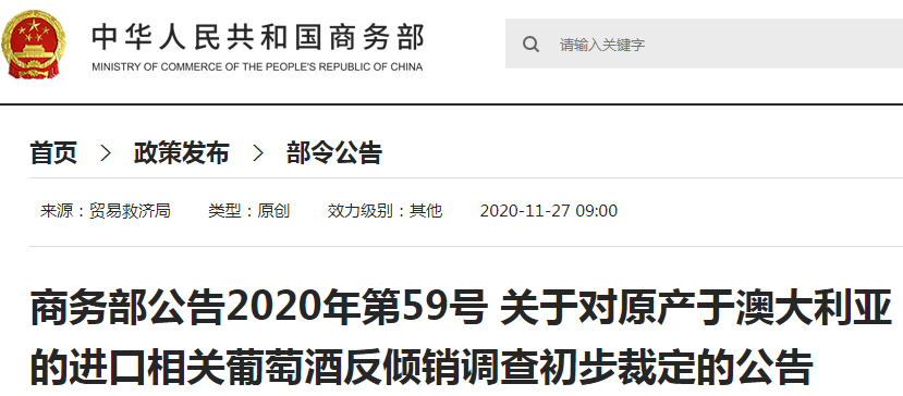 商务部网站11月27日消息,商务部日前发布2020年第59号公告称,调查机关初步认定,原产于澳大利亚的进口相关葡萄酒存在倾销,国内相关葡萄酒产业受到实质损害,而且倾销与实质损害之间存在因果关系。根据《反倾销条例》第二十八条和第二十九条的规定,调查机关决定采用保证金形式实施临时反倾销措施。