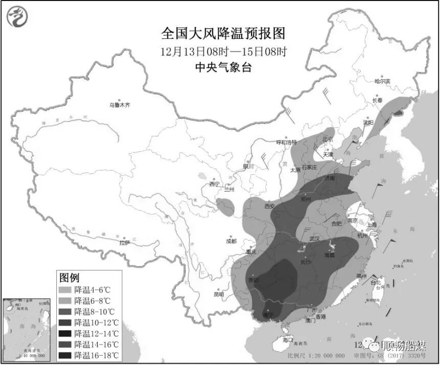 中央气象台预计,12月12日08时至12月15日08时,西北地区东部、内蒙古中西部、华北中西部、东北地区东部、黄淮大部、江汉、江淮西部、江南中西部、西南地区东部、华南中西部等地将先后降温6~8℃,其中,陕西北部、内蒙古西部、湖南西南部、贵州东南部、广西北部等地的部分地区降温可达10℃;降温过后最低气温0℃线将南压至贵州南部至浙江西北部一线。北方地区有4~6级、阵风7~8级的偏北风,南方地区有4~5级偏北风,江河湖面阵风可达6~7级,近海海区有6~8级、阵风9级的偏北风。