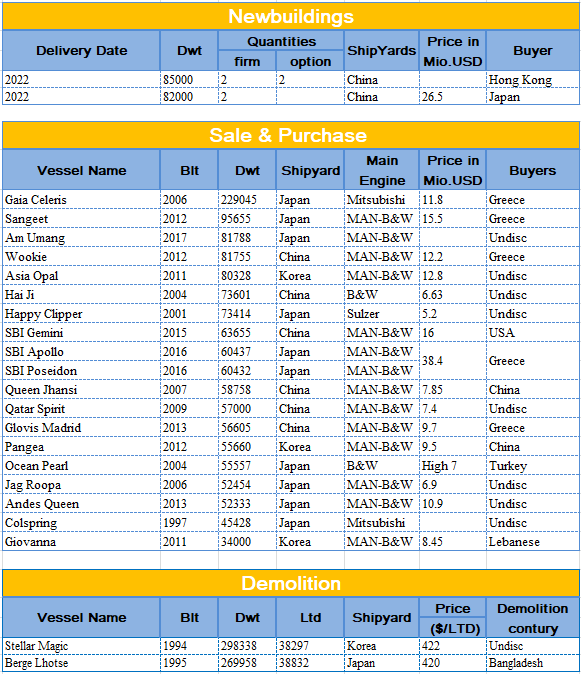 BPI周五报收1,465点,同比上周末上涨134个点。巴拿马型船期租水平报收13,183美元/天,同比上周上涨1,200美元/天。巴拿马型船市场大涨。大西洋市场需求旺盛,TA成交上涨,美湾货盘回归稳定,成交比上周略涨,南美需求一般,82k成交大概在13,500美元/天,加 350,000 美元的空放补贴左右。太平洋市场表现强劲,印尼方向非常活跃,价格被不断推高。澳洲方向成交价也被带高,82k成交大概在12,000-13,000美元/天的水平。Nopac同样上涨,82k成交超过了13,000美元/天的水平。期货同样上涨,期租比较活跃。