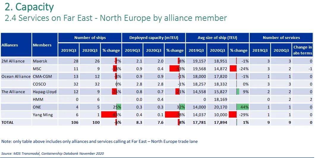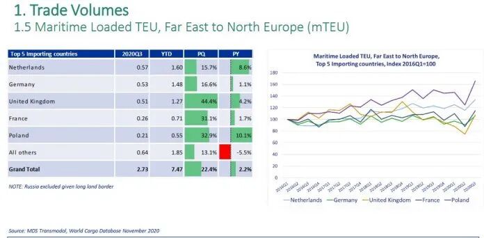 此外,亚洲到欧洲贸易的平均运力同比下降了6% ,这是联盟转移了船舶运力,以弥补贸易需求的减少。与此同时,数据显示,2020年第三季度亚洲至欧洲航线的货运量比2019年同期增长2.2%,其中前往波兰的货运量增幅最大。