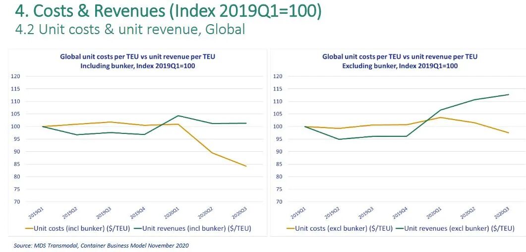 根据MDS Transmodal的单位收入($/TEU)在Covid-19产生任何影响之前于2020年第一季度开始增长,这反映了部署运力的增加,以及考虑到低硫燃料(LSFO)的引入而征收的附加费。