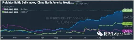 然而在集装箱运输中这种联系并不是那么明显。根据波罗的海指数BDI(Freightos Baltic Daily Index),9月下旬,从亚洲出口到美国西海岸的价格上升到了3835美元/ FEU。班轮公司显然是运价急剧上涨的最大受益者。