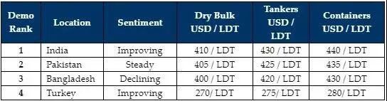本周孟加拉国拆船价格突然出现下降,而印度次大陆的拆船价格则比较平均,处于400-410美元/ldt的水平。目前,越来越多的VLOC和好望角型等大型干散货船投入拆船市场。总体来看,拆船市场活跃,全球钢铁市场没有显示出衰退的迹象,行业明年预期较为乐观,因此拆船价格水平将保持稳定态势。